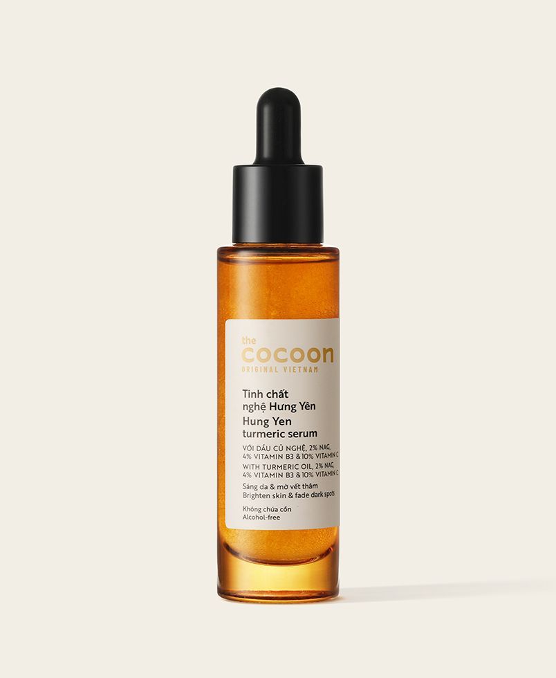 Cocoon Tinh chất nghệ Hưng Yên là sự kết hợp giữa dầu nghệ được chiết xuất từ củ nghệ Hưng yên rất giàu turmerone, được xé nhỏ và lơ lửng trong một hỗn hợp kết cấu mọng nước chứa Vitamin B3, NAG và Vitamin C (3-o-ethyl ascorbic acid) tạo thành tinh chất nghệ có tác dụng chống oxy hóa mạnh mẽ giúp tăng cường khả năng làm sáng da, cải thiện làn da xỉn màu và làm mờ vết thâm.