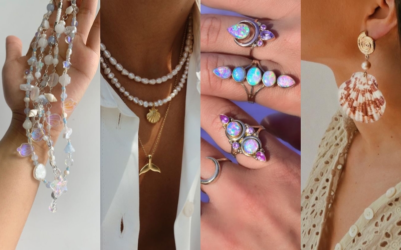 Bộ phim live-action “The Little Mermaid” (do Halle Bailey đóng vai chính) đã khơi dậy trào lưu thẩm mỹ lấy cảm hứng từ vẻ đẹp huyền ảo của các nàng tiên dưới đáy đại dương. Phong cách này xuất hiện trên quần áo, móng tay, cách trang điểm… Trang sức không phải là một ngoại lệ. Với xu hướng này, các món trang sức mang mô-típ liên quan đến biển cả như vỏ sò, ngọc trai, khảm xà cừ lấp lánh,… Màu sắc đặc trưng nghiêng về các màu pha trộn giữa sắc tím, xanh dương, hoặc các hiệu ứng màu sắc óng ánh tạo cảm giác về sự kỳ ảo.