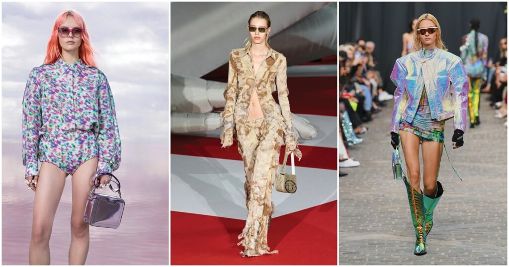 Mùa hè của Nina Ricci mở đầu với trang phục nghỉ mát mang họa tiết hoa nhí được xử lý loang bắt mắt. Còn ở Loewe, thời trang mùa hè mang nét tinh nghịch và trẻ trung hơn với mẫu quần tạo hiệu ứng pixel. Bắt nhịp xu hướng màu loang in kỹ thuật số hiện đại, chiếc đầm lụa ôm dáng của David Koma trở nên mạnh mẽ hơn bao giờ hết khi kết hợp với áo khoác racer và giày bốt ánh kim theo phong cách Motorcore. Cũng cá tính nhưng có phần quyến rũ hơn là những bộ trang phục matchy-matchy loang màu rực rỡ của Diesel. Ở lãnh địa trang phục công sở, nhà mốt Peter Do và Prada thách thức những quy chuẩn văn phòng với các thiết kế mang màu sắc sặc sỡ, được cách điệu phom dáng để trở nên trẻ trung, thoải mái hơn.