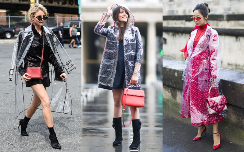 Đã qua rồi cái thời phải diện những chiếc áo mưa rộng thùng thình, vừa kém thời trang mà lại bất tiện. Áo mưa trong suốt đặc biệt phù hợp với thời tiết cuối Hè – đầu Thu không quá lạnh nhưng lại thường đổ mưa bất chợt. Các nhà thiết kế đã “nâng cấp” mẫu áo mưa quen thuộc này thành kiểu áo khoác trong suốt có thể mặc được hằng ngày, với vô vàn kiểu dáng và chi tiết màu sắc khác nhau. Với một chiếc áo mưa trong suốt, bạn có thể khoe trọn bộ trang phục cá tính của mình mà vẫn không lo bị nước mưa ngấm ướt.