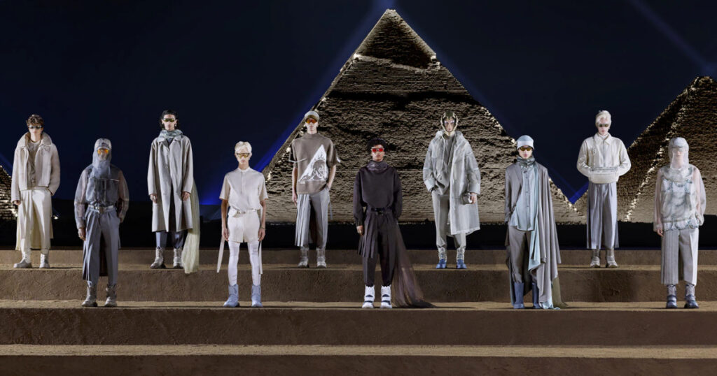 Lấy Đại kim tự tháp Giza, tọa lạc ở thủ đô Cairo (Ai Cập), làm bối cảnh trình diễn BST Thu Đông 2023, NTK Kim Jones mượn hình tượng bầu trời, các chòm sao và các vị thần quyền năng trong thần thoại để gọi tên niềm say mê về các tín ngưỡng và biểu tượng tâm linh của nhà sáng lập Christian Dior.