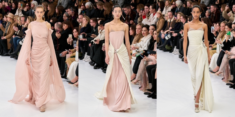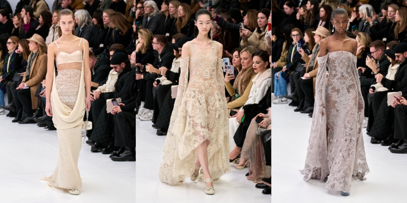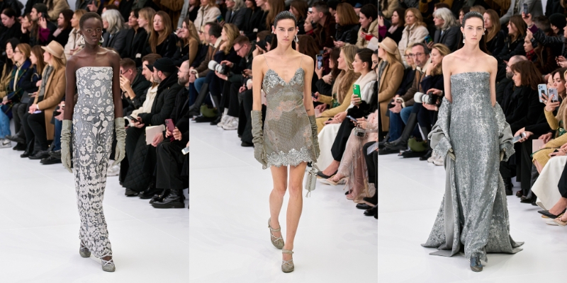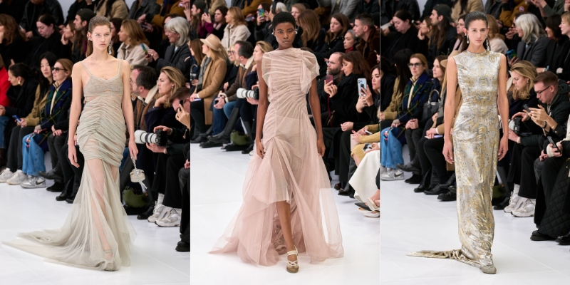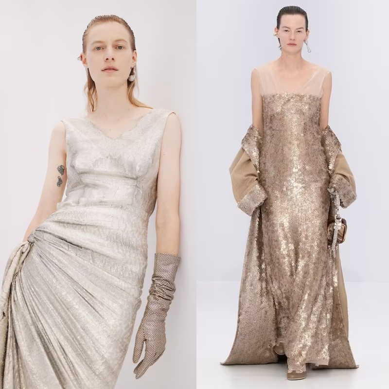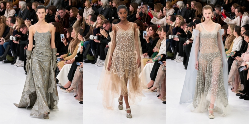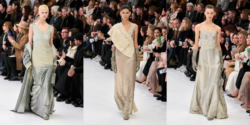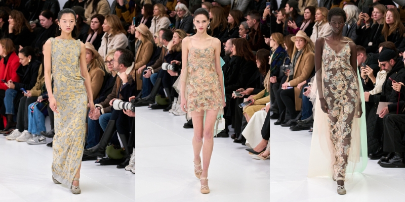 Với kiểu dáng tối giản, BST tập trung khai thác kỹ thuật thủ công tinh xảo. Người xem gần như rất khó để nhận ra hoa văn ren in phủ trên một số chiếc đầm bạc, hay đôi găng với chi tiết móc kim loại lấp lánh. Ngoài ra, các nếp gấp và xếp nếp nhẹ nhàng gợi nhớ về chiếc đầm lụa Fendi của Karl Lagerfeld cùng nghệ thuật điêu khắc cổ điển của Rome, và cả âm hưởng của thập niên 30.