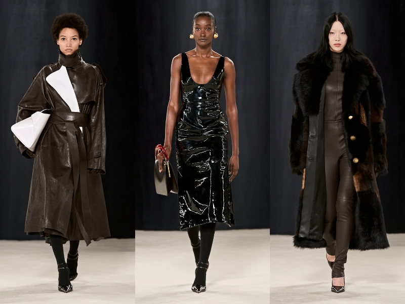 Không có bản in hay hoa văn nào quá nổi bật, nhưng Davis đã sử dụng một bảng màu sang trọng cổ điển – trắng, xám và đen, đôi khi “lóe sáng” rực rỡ với vàng, xanh biển và đỏ. Cùng với đó là các yếu tố kết cấu độc đáo (ví dụ: tạo kiểu cho một chiếc đầm ba lỗ đơn giản bằng nhựa vinyl lỏng) góp phần tạo nên điểm nhấn thị giác đặc biệt. Hơn cả lối chơi bóng bẩy và quyến rũ tinh tế, các phụ kiện của Davis là một điểm nhấn rõ ràng của BST. Mùa thu 2023, Ferragamo đem đến một loạt kiểu dáng túi xách quá khổ đủ lớn để đựng vừa “cả thế giới”. Ngoài ra, còn có những chiếc túi cầm tay khổ vừa với tông màu đen – nâu sang trọng, họa tiết hình in thời thượng và được làm từ chất liệu da cao cấp tuyệt đẹp.