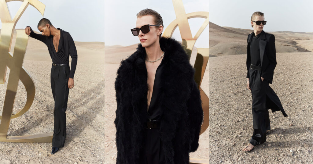 Quần cạp cao với ống rộng tạo hiệu ứng kéo dài chiếm ưu thế, được nhấn nhá bằng những món phụ kiện tiết chế hoặc cường điệu hóa. Các thiết kế nhìn chung thoải mái hơn, cho thấy được sự thư thái của cuộc sống thường nhật tại Marrakech. Áo khoác được thiết kế rộng rãi, uyển chuyển, cấu trúc bớt cầu kỳ: áo khoác satin thắt đai lưng trùm tới gót chân đối lập với những chiếc áo khoác may đo mang phom dáng sắc cạnh. Grain de poudre, một loại vải len mịn được Yves Saint Laurent vô cùng yêu thích và thường xuyên sử dụng, cũng xuất hiện nhiều xuyên suốt BST Saint Laurent Xuân Hè 2023 dành cho nam giới.