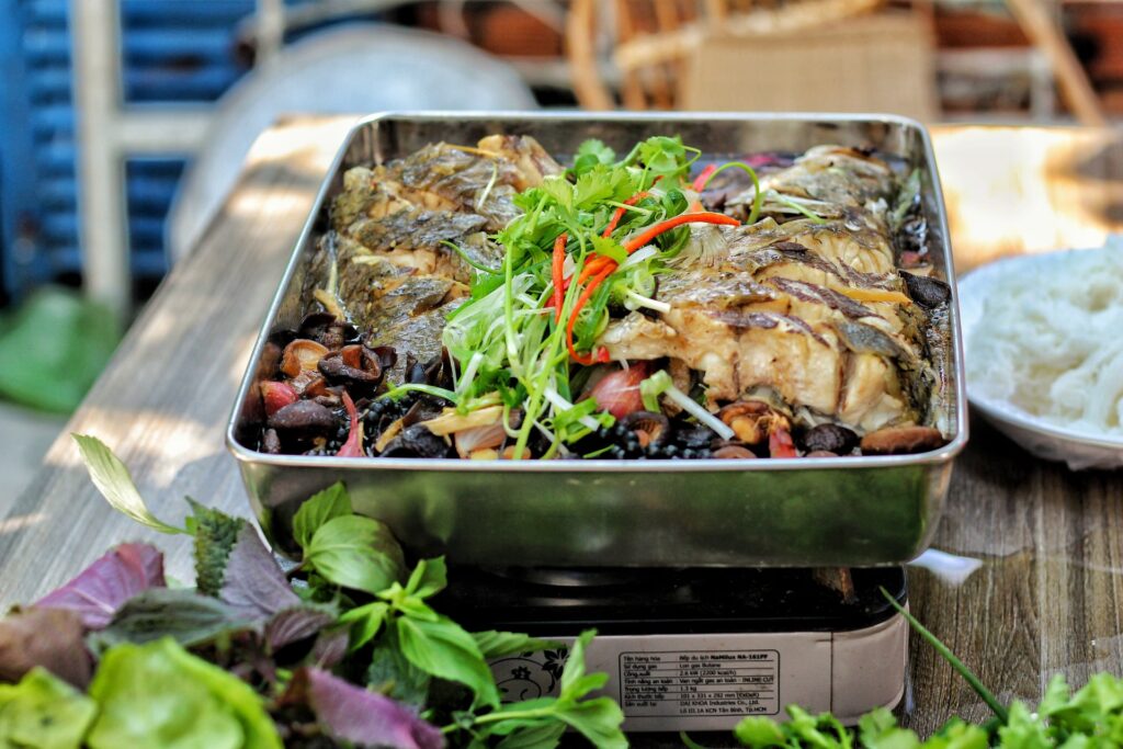 Để món cá luôn ngon, mọi người nhớ chuẩn bị một khay inox để có thể đun luôn trên bếp nha. Món này khi dọn ra, cho thêm ít ớt sừng cắt lát mỏng, ít gừng cắt sợi và thật nhiều hành lá chẻ hoặc bào mỏng rồi ăn kèm với cơm trắng hoặc bún hay cuốn bánh tráng. À nhớ chuẩn bị thêm ít bún tàu để ăn cho hấp dẫn nha.