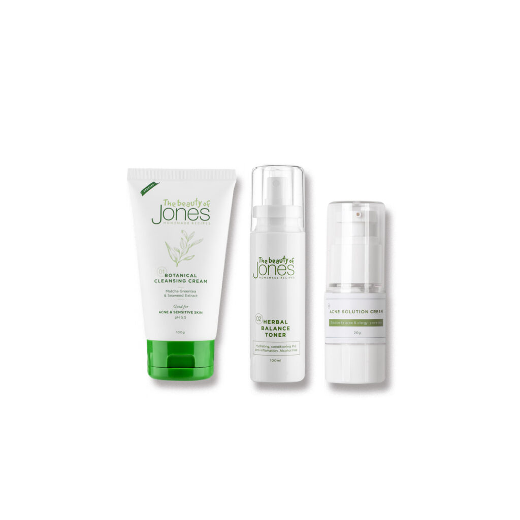 Đôi nét về thương hiệu The Beauty Of Jones (TBOJ), The Beauty Of Jones là thương hiệu mỹ phẩm đã ra đời cách đây 5 năm. Hãng hướng đến các thành phần thiên nhiên và an toàn của khách hàng luôn được đặt lên hàng đầu. Nhờ chú trọng vào các sản phẩm hữu cơ, The Beauty Of Jones đã có nhiều kinh nghiệm trong việc điều chế mỹ phẩm trị mụn dịu nhẹ mà vẫn đảm bảo hiệu quả. Botanical Cleansing Cream-Sữa rửa mặt trà xanh-tảo biển: Điểm đặc biệt ở sản phẩm này là sữa rửa mặt có hiệu quả sạch sâu nhưng không tạo bọt, không gây khô và kích ứng da. Chiết xuất trà xanh matcha Nhật, tảo biển, nước hoa cúc trắng… các thành phần thiên nhiên dịu nhẹ cho da nhạy cảm nhất. Độ ph vàng ở mức 5.5, giúp làm sạch hiệu quả không gây châm chích, căng rát. + Herbal Balancing Toner-Toner hoa cúc: Toner có 2 thành phần chính gồm nước chưng cất hoa cúc la mã, cúc xu xi. Các loại hoa đều đạt chuẩn canh tác, không có thuốc trừ sâu, chất bảo quản. Công dụng thu nhỏ lỗ chân lông, làm dịu da, cân bằng độ ẩm, độ ph.  Làm sạch sâu bụi bẩn, dầu thừa. + Acne Solution Cream-Kem trị mụn tràm trà:   Với những bạn hay bị mụn thì không thể không biết đến một “gương mặt vàng trong làng trị mụn” đó là em tinh chất tràm trà.   Kem mụn chiết xuất tràm trà, rau sam, rau má giúp kháng viêm, kháng khuẩn, ngừa mụn phát triển. Làm xẹp mụn viêm chỉ trong 48h. Gom khô cồi mụn giúp lấy nhân mụn dễ dàng hơn không để lại thâm sẹo.  Ưu điểm lớn nhất của combo mỹ phẩm trị mụn từ The Beauty Of Jones chính là tất cả thành phần đều chiết xuất 100% thiên nhiên. Điều này đảm bảo cho những bạn da mụn mà lại nhạy cảm có thể yên tâm khi sử dụng sản phẩm. Ngoài ra sản phẩm còn đạt chứng nhận an toàn từ sở y tế, mẹ bầu hay mẹ bỉm sau sinh có thể thoải mái sử dụng mà không lăn tăn nữa nha.