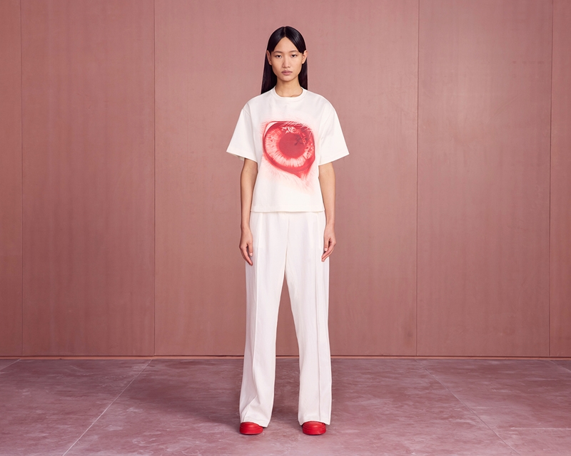 Các sắc thái phong phú của màu đỏ, xanh lam và trắng làm sống động những cảnh quan trang trí thơ mộng tương phản với những món đồ đơn sắc màu đỏ Ferragamo, chẳng hạn như giày thể thao bằng da có họa tiết đục lỗ và áo cánh mềm mại bên ngoài váy xếp ly.