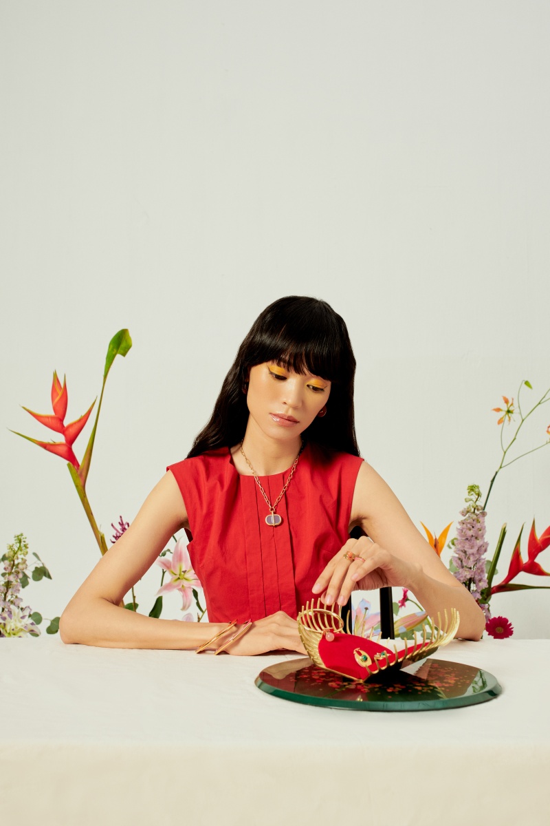 Điển hình là những thiết kế trang phục trong “Kỳ hoa dị thảo”. Chúng là điểm giao thoa hoàn hảo giữa thời trang đường phố vốn là lợi thế của Tom với những chất liệu thủ công tinh hoa như sơn mài và lụa Lãnh Mỹ A – đặc trưng của Hanoia. Sơn mài, lụa Lãnh Mỹ A đều được Tom xử lý dưới dạng những chi tiết điểm nhấn để giữ được tính ứng dụng trong đời sống.