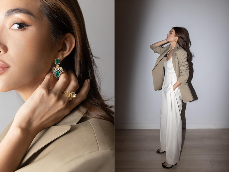 Á hậu Hoàn vũ Việt Nam 2015 trong outfit theo phong cách thời trang menwear cá tính. Đi kèm trang phục tông màu tối giản hợp xu hướng, người đẹp không quên tạo điểm nhấn cho bộ trang phục bằng phụ kiện kim cương. Cô khéo léo chọn bộ trang sức thật nổi bật, kết hợp ngọc Lục Bảo và kim cương, giữa màu xanh tươi trẻ với vàng uy quyền.