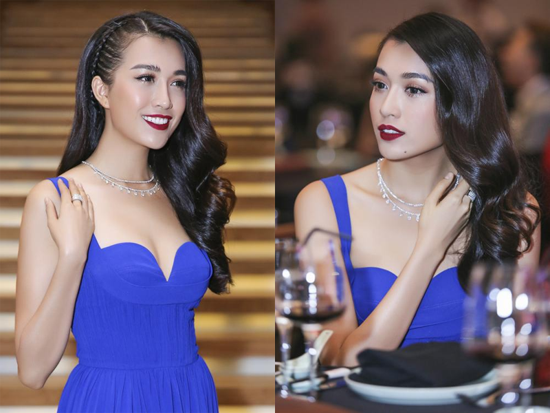 Khi diện bộ đầm dạ hội tông màu xanh coban, người đẹp sinh năm 1993 tiếp tục thể hiện gu thẩm mỹ tinh tế khi chọn trang sức kim cương gồm vòng cổ, nhẫn sắc trắng. Kim cương trắng lấp lánh nổi bật trên nền màu xanh đem đến cho Lệ Hằng vẻ đẹp cổ điển đầy sức hút. Được biết, Á hậu là “fan cuồng” của kim cương và có hẳn một bô sưu tập kim cương riêng, trong đó cô chuộng nhất là các thiết kế kim cương của NTK Ngọc Đoàn.