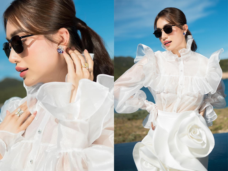 Để tạo điểm nhấn khi diện đầm trắng đơn sắc, Lệ Hằng đã lựa chọn bộ trang sức kết hợp giữa ngọc Lục Bảo, kim cương và đá sapphire. Bản phối tinh tế này đã đem đến cho người đẹp diện mạo tươi trẻ, tràn đầy năng lượng mà vẫn vô cùng duyên dáng.