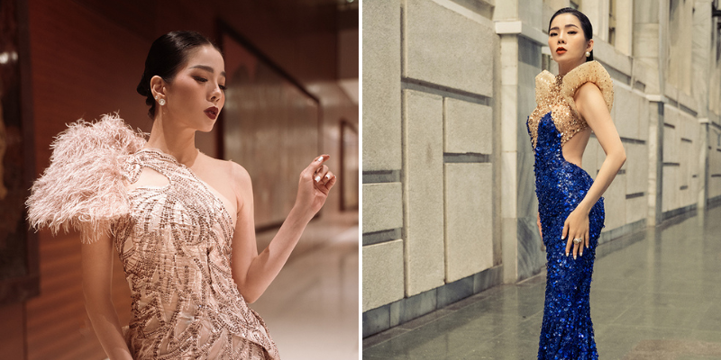 Trước đây, trong nhiều đêm nhạc, Lệ Quyên cũng khoe dáng với váy dạ hội đính kết công phu, được Hoàng Hải thực hiện riêng. Lấy cảm hứng từ vẻ đẹp quý tộc, kiêu sa của loài chim công, bộ đầm sắc hồng pastel ôm sát hình thể của Lệ Quyên. Đuôi váy mềm mại, rủ nhẹ và tạo sóng khi di chuyển, khiến mỗi bước đi của Lệ Quyên thêm phần quyến rũ.