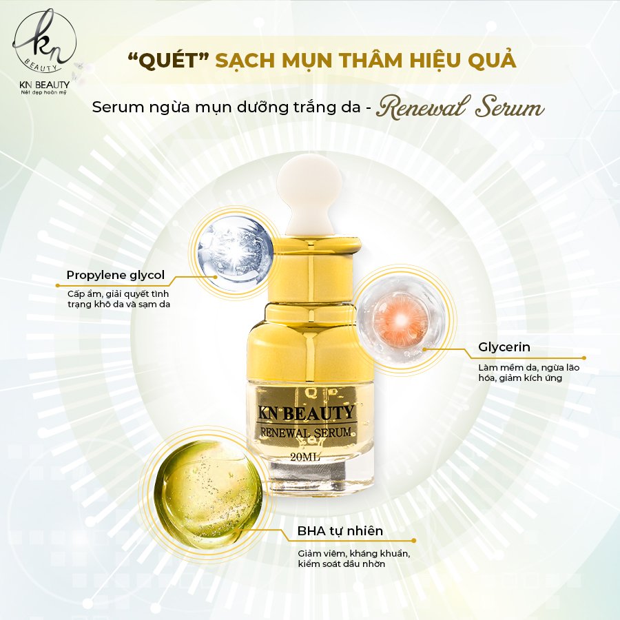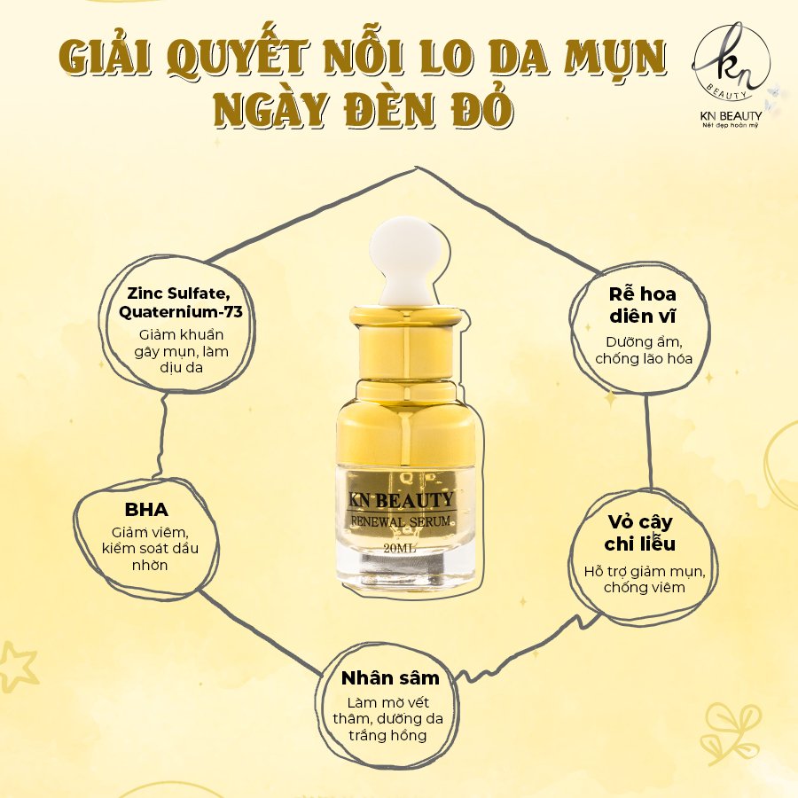 Mùa hè đang đến gần, và không chỉ làm chúng ta mệt mỏi vì thời tiết nóng bức, mà còn khiến làn da của chị em trở nên nhạy cảm hơn, với vấn đề mụn thâm, da cháy nắng và tình trạng đen sạm. Vết thâm do mụn để lại, da sần sùi, và lỗ chân lông to là những vấn đề mà nhiều người phải đối mặt. Để giải quyết những vấn đề này, KN Beauty tự hào giới thiệu đến bạn sản phẩm mới – Serum Ngừa Mụn Dưỡng Trắng Da – Renewal Serum.