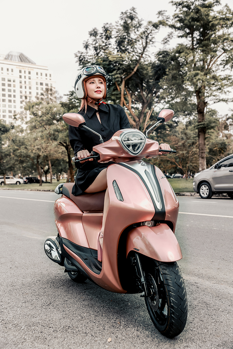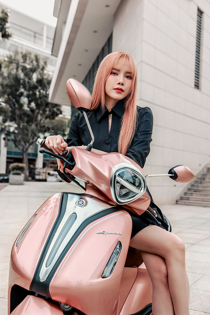 Đặc biệt, cô nàng còn khéo léo kết hợp với một “phụ kiện” cực ấn tượng – chiếc xe tay ga Yamaha Grande màu hồng ánh đồng trendy, làm tăng thêm vẻ năng động, nữ tính và quyến rũ của giọng ca này. Được biết, đây là một trong những phương tiện di chuyển mà cô nàng vô cùng yêu thích gần đây.