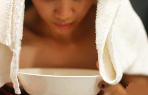 Bước 3: Bắt đầu xông hơi bằng cách trùm một chiếc khăn lên đầu và để khuôn mặt đối diện với nồi nước vừa mới đun sôi trong khoảng 5 – 10 phút.
