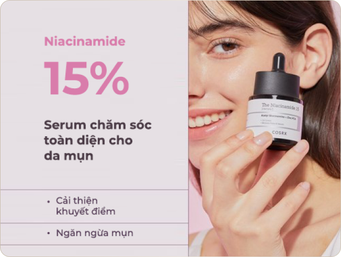 15% Niacinamide hàm lượng cao có tác dụng làm giảm mụn, kiểm soát dầu thừa và se khít lỗ chân lông. Serum COSRX RX Serum 15% Niacinamide còn được nhiều Beauty Blogger tin chọn bởi ngoài 15% Niacinamide, serum nhà COSRX là 1 trong vài sản phẩm có 2% NAG giúp làm mờ các đốm nâu và Zin PCA giúp giảm viêm, kháng khuẩn và điều tiết bã nhờn.