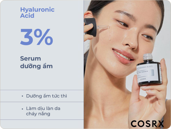 Serum Hyaluronic 3% có thể lập tức làm mát và dịu làn da bị tổn thương do ánh nắng mặt trời. Đồng thời, Các thành phần axit amin và ceramide cung cấp dưỡng chất đầy đủ cho lớp sừng bị khô do các yếu tố bên ngoài và phục hồi nhanh chóng lớp màng bảo vệ da, giúp da luôn đủ ẩm, căng bóng.