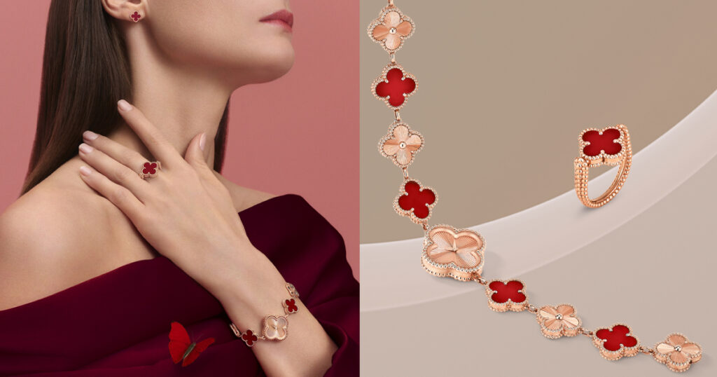Bốn sáng tạo mới trong BST Alhambra mang đến vẻ đẹp cuốn hút với sự kết hợp của guilloché vàng hồng tạo hiệu ứng ánh sáng và đá carnelian óng ánh.