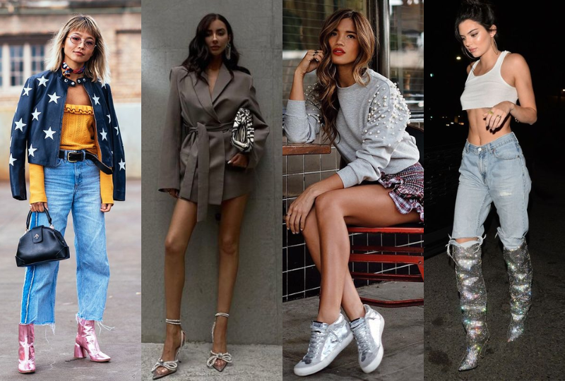 Với tinh thần lấp lánh “từ đầu đến chân”, các nhà thiết kế chắc chắn không thể bỏ qua những đôi giày trong “cơn lốc” rực rỡ này. Từ giày cao gót cho đến giày thể thao, từ những đôi Mary Jane cổ điển cho đến bốt đùi “hầm hố”,… tất cả đều có thể tỏa sáng thật long lanh với pha lê, đính đá, chất liệu ánh kim hay sequin. Một đôi cao gót lấp lánh kết hợp cùng đầm trơn màu ôm sát, nếu bạn yêu thích phong cách quyến rũ thời thượng. Giày thể thao đính đá sẽ phù hợp với những set đồ năng động hơn như chân váy ngắn, quần short dạ,… Nếu bạn là tín đồ của sự đơn giản mà vẫn say mê những đôi giày lấp lánh, thì hãy chú ý lựa chọn gam màu dễ dùng như đen, trắng, xám, ánh bạc,… để có thể kết hợp được với nhiều trang phục hơn.